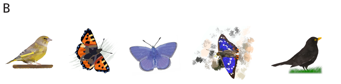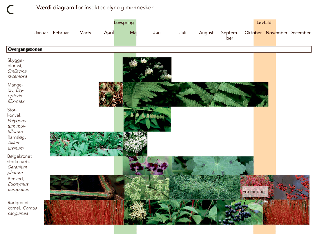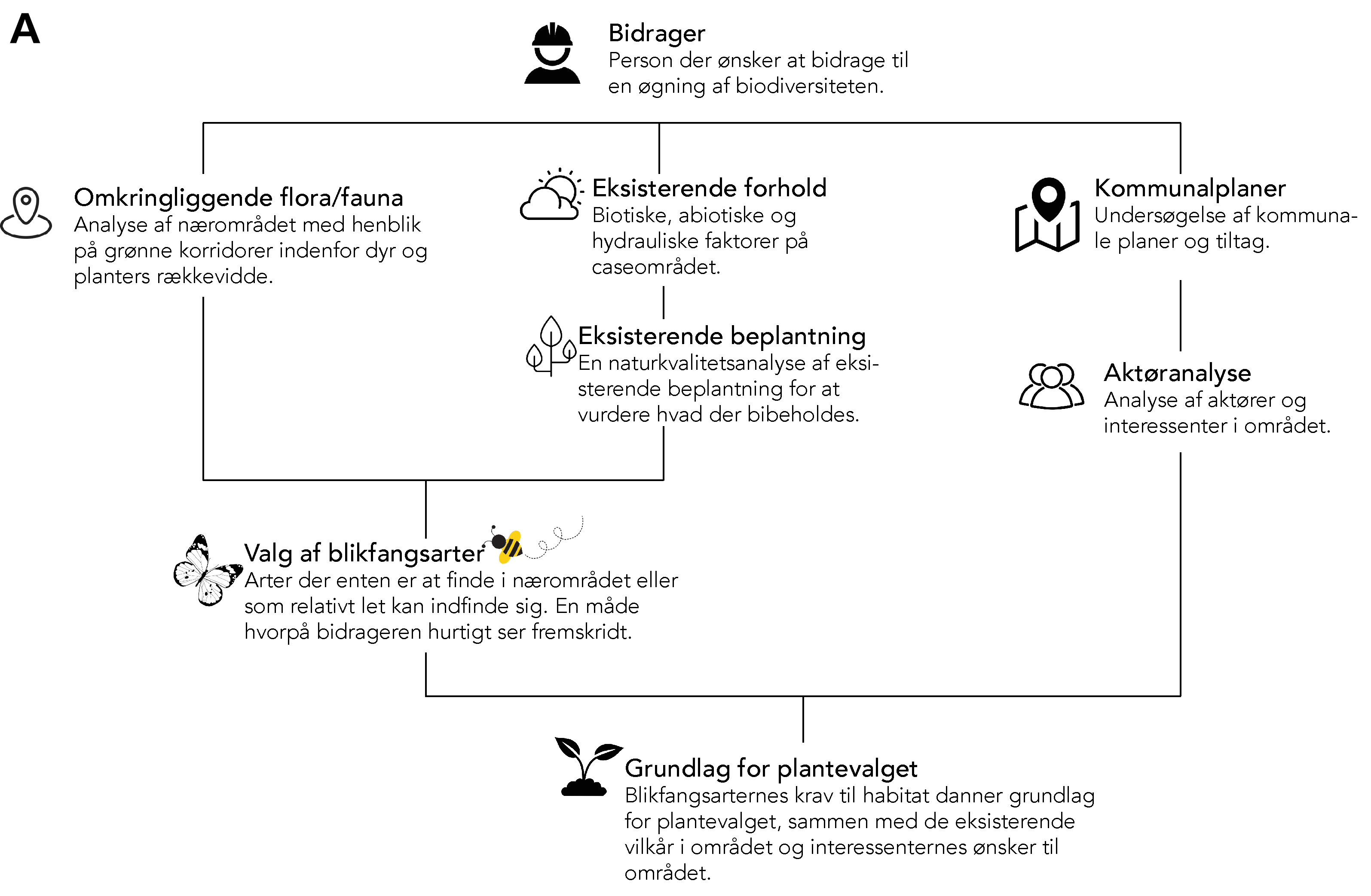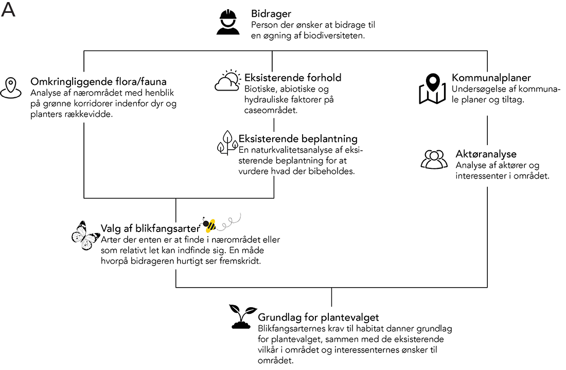 Plantevalget baseres på analyserne i Figur 1A og formidles via en beplantningsplan og en rydningsplan. I dette trin udpeges også letgenkendelige fuglearter og insekter knyttet til plantevalget (Figur 1B og 1C). Disse ”blikfangsarter” har til formål at knytte bånd til brugerne af kulturzonen og fastholde fokus på vigtigheden af naturzonen.