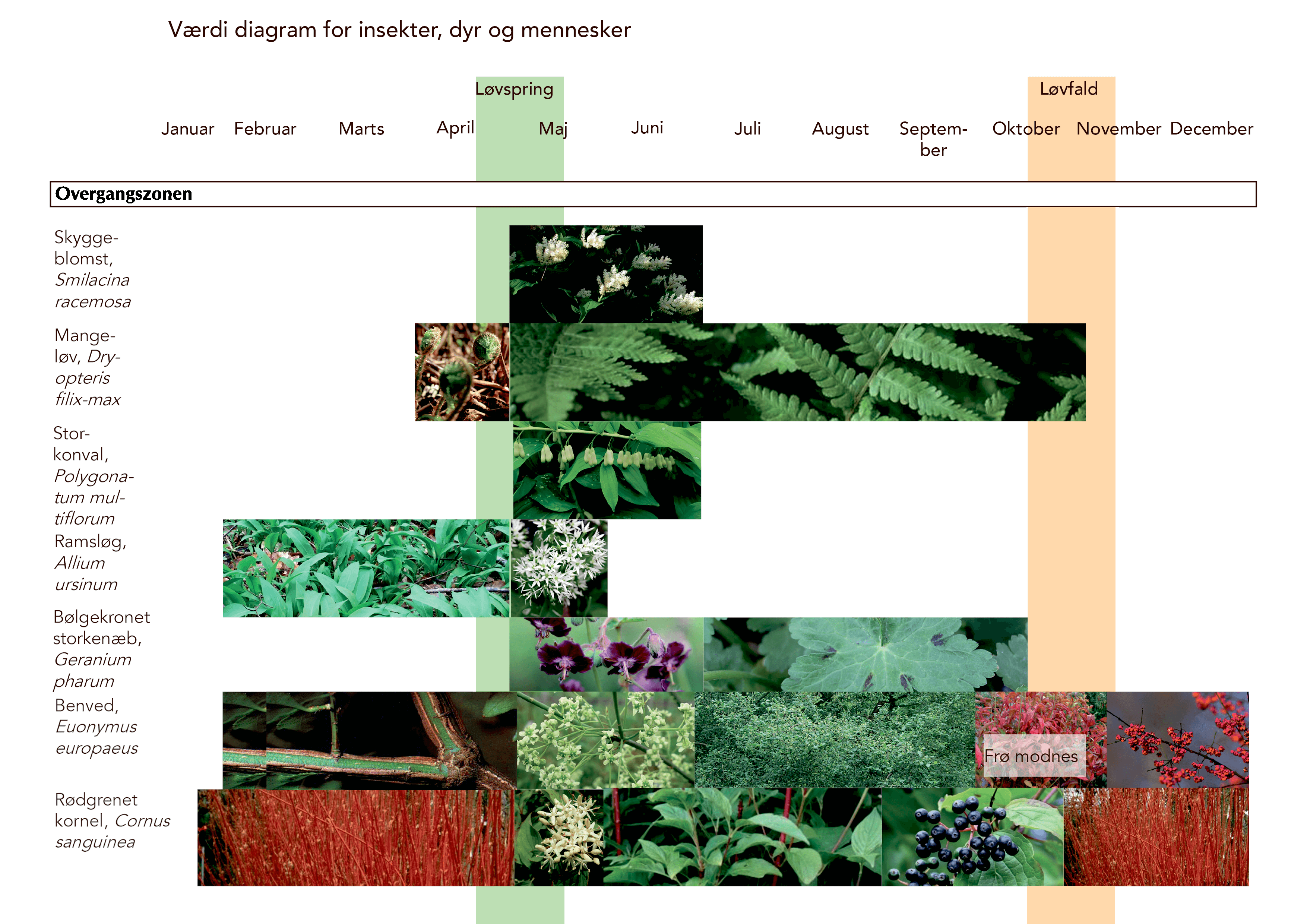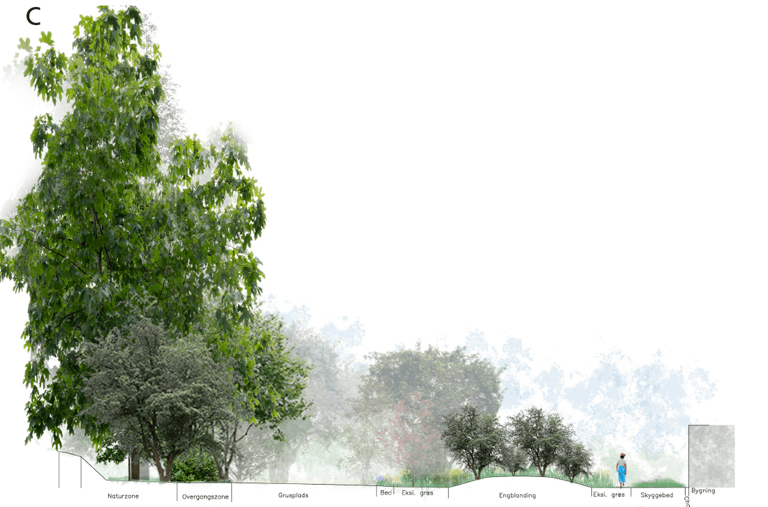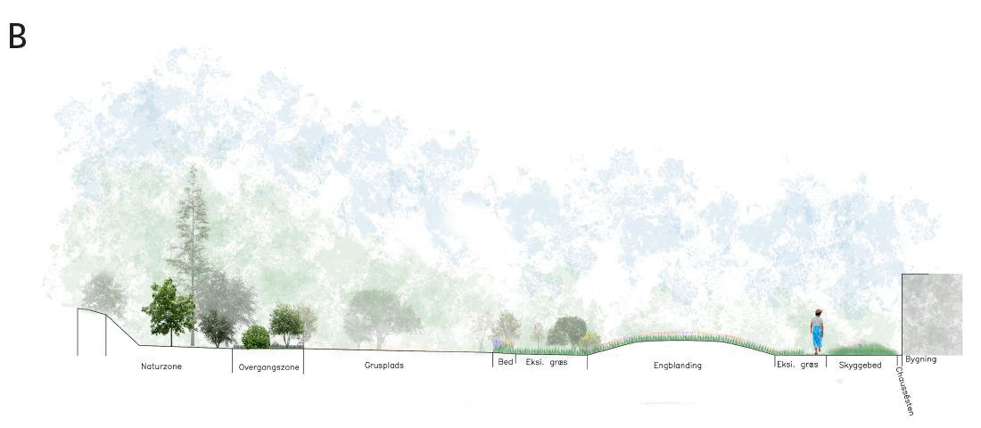 Overgangszonen bevidstgør landskabsarkitekten om tiltag og beplantningselementer til gavn for mennesket og biodiversiteten. Zonerne er opdelt med forskellige driftsanvisninger. I figur 4 eksemplificeres ekstremerne med kulturzonens velholdte terrasse versus naturzonen i det fjerneste område, som kun kan tilgås via bjælkesti.