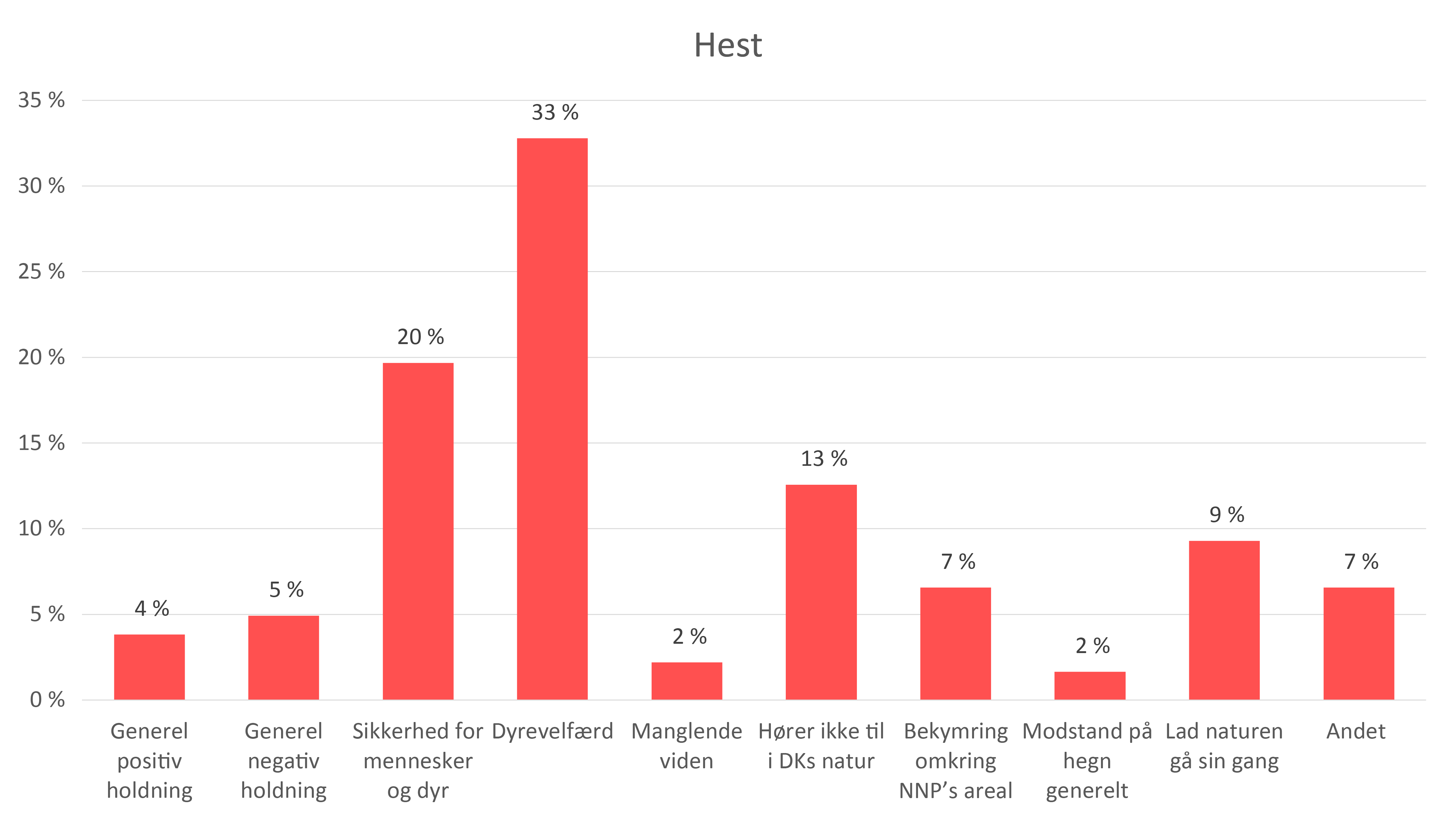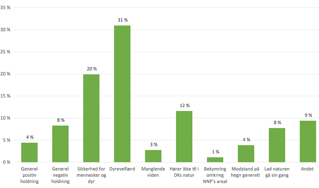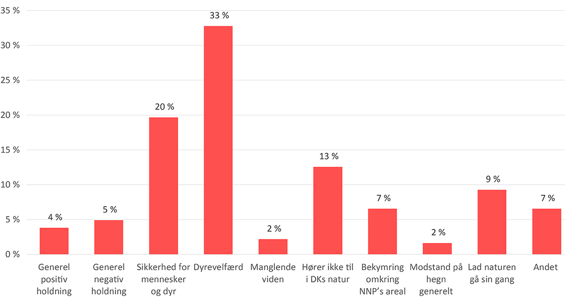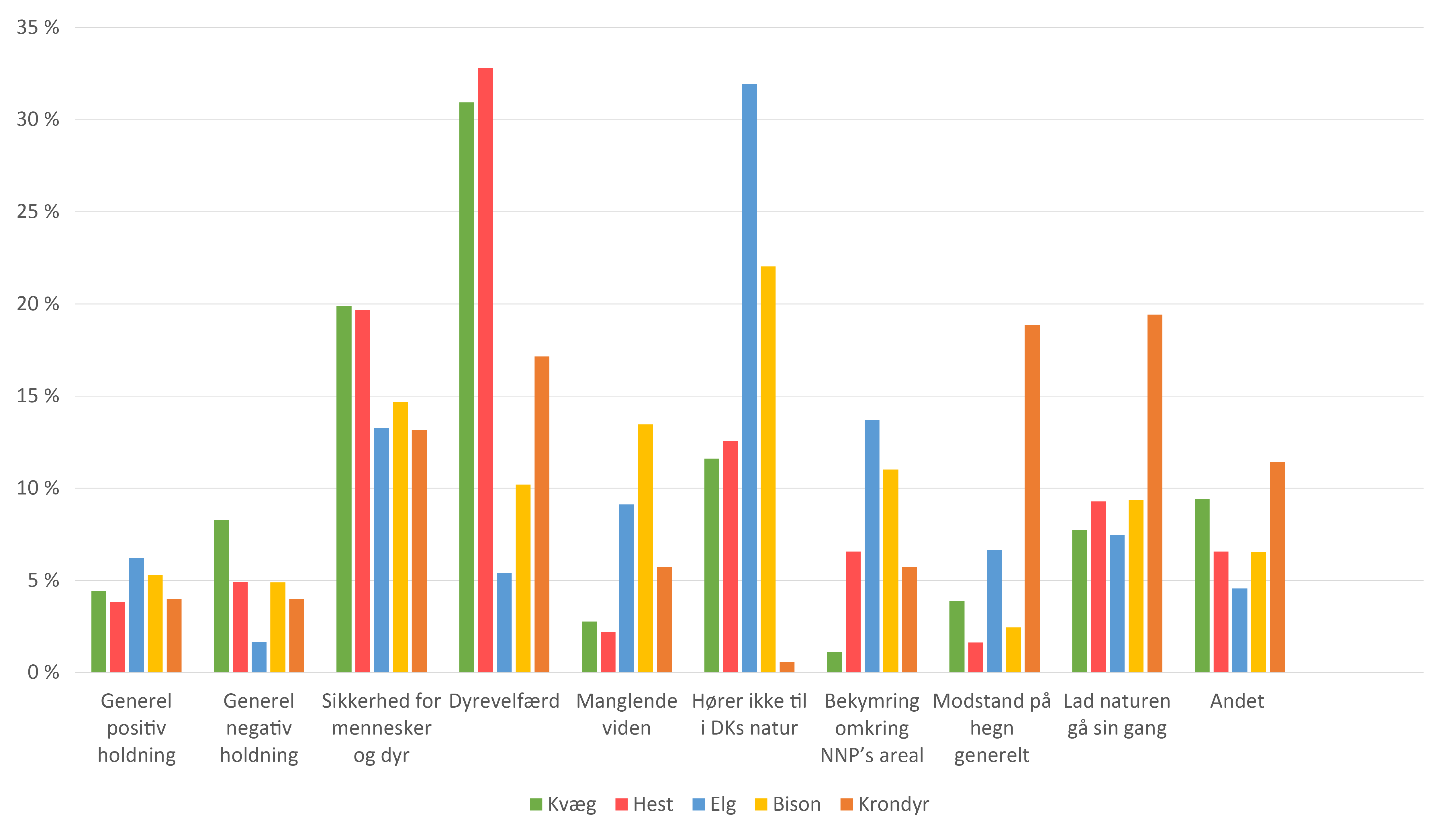 Den offentlige debat vedrørende udsætning af tamdyr i kommende naturnationalparker har været intens. Derfor er det ikke overraskende, at data viser, at dyrevelfærden er en væsentlig bekymring (31 % for kvæg og 33 % for heste).