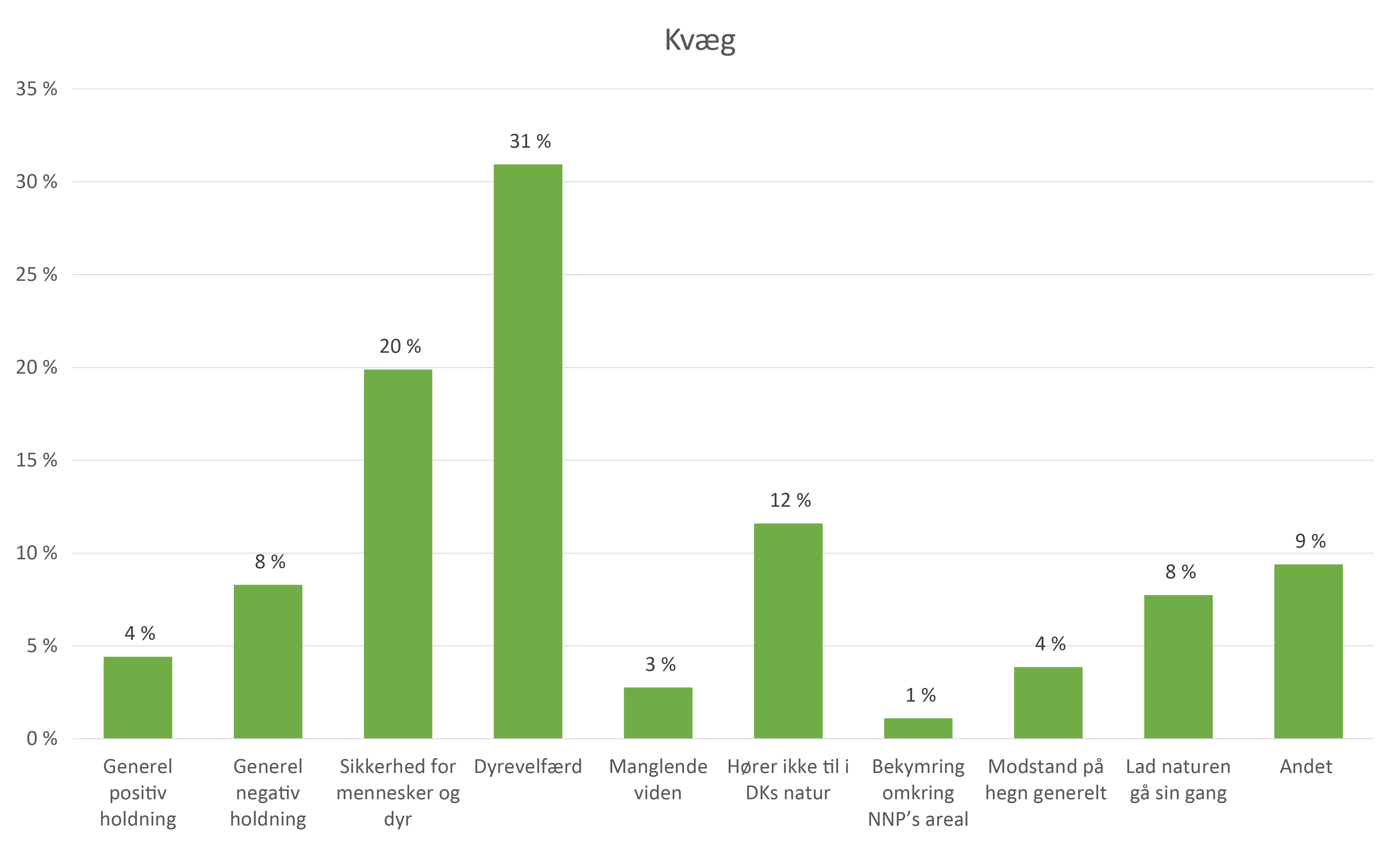 For at muliggøre en kategorisering af fritekst-svarene, blev samtlige 1049 fritekst-svar på svarmuligheden ”Hvis der er andre forhold ved de dyr [KVÆG, HESTE, ELGE, BISONER, KRONDYR], der sættes ud i naturnationalparkerne, som du har meninger om, og som ikke er nævnt ovenfor, er du velkommen til at beskrive dem kort her” gennemgået. På baggrund af denne gennemgang blev der slutteligt udviklet i alt ti kategorier, hvortil alle svarene kunne kategoriseres. Denne bearbejdning af data, muliggør en visuel fremstilling af eksempelvis befolkningens mulige bekymringer i relation til hver enkelt undersøgte dyreart – kvæg, hest, elg, bison og krondyr.