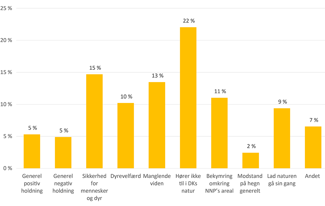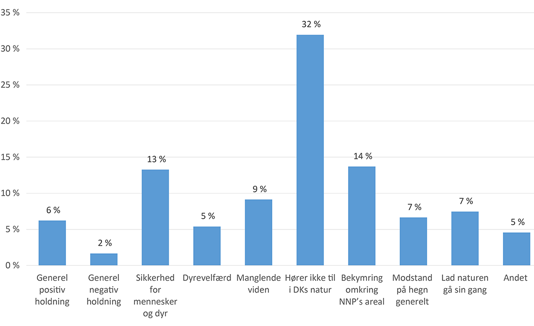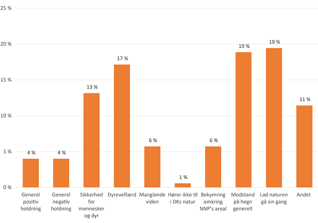 Det er interessant, at flere svarpersoner giver udtryk for, at de accepterer risikoen for, at dyrene i perioder er sultne eller sågar går med uopdagede skader. Til trods for dette er bekymringen vedrørende dyrevelfærden stadig velpræsenteret (17 %). Det er værd at bemærke, at mange fritekst-svar kredser om det faktum, at dyrenes færden er begrænset af hegn – og at der dermed følger et øget ansvar også over for denne dyregruppe.