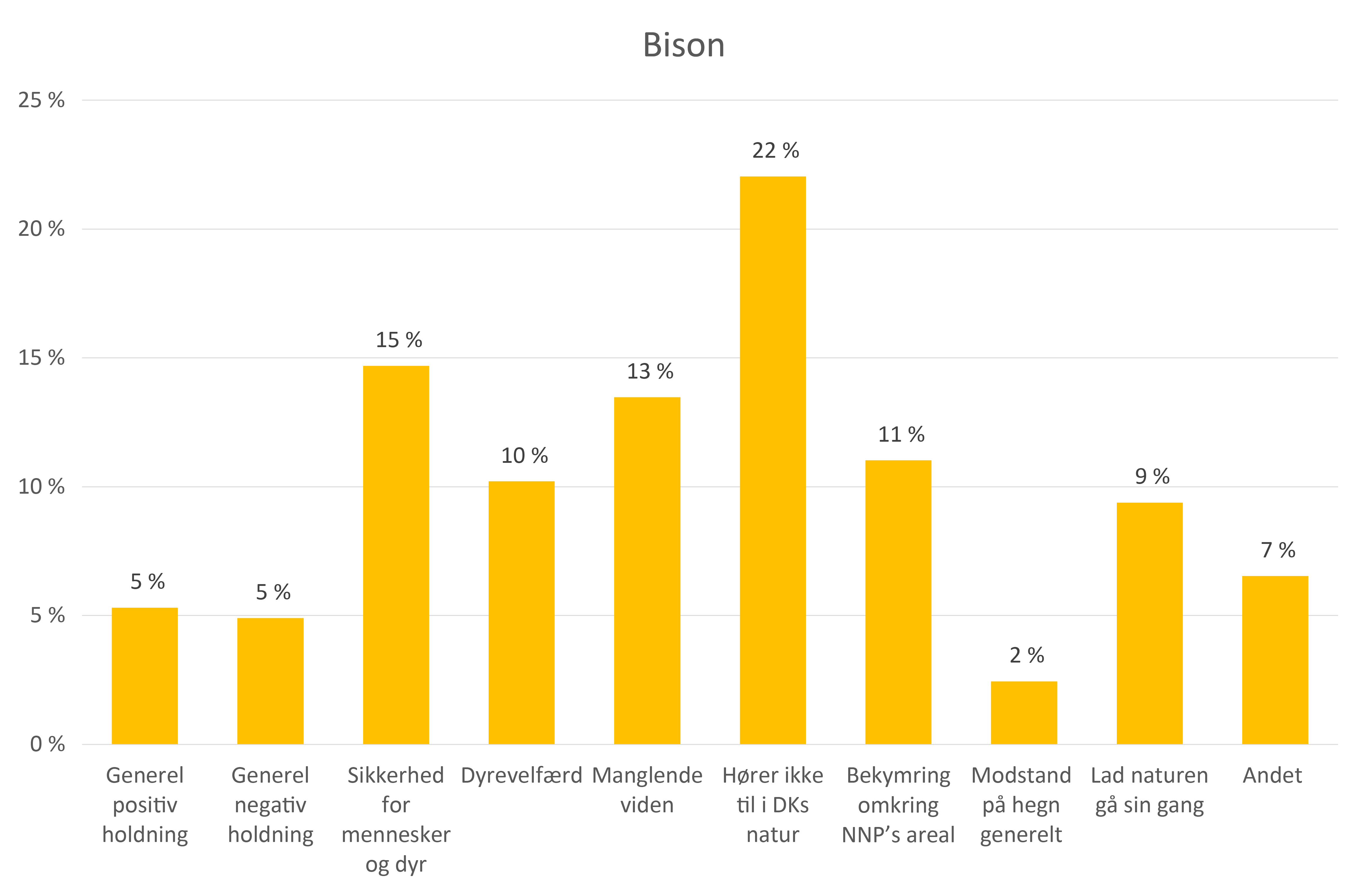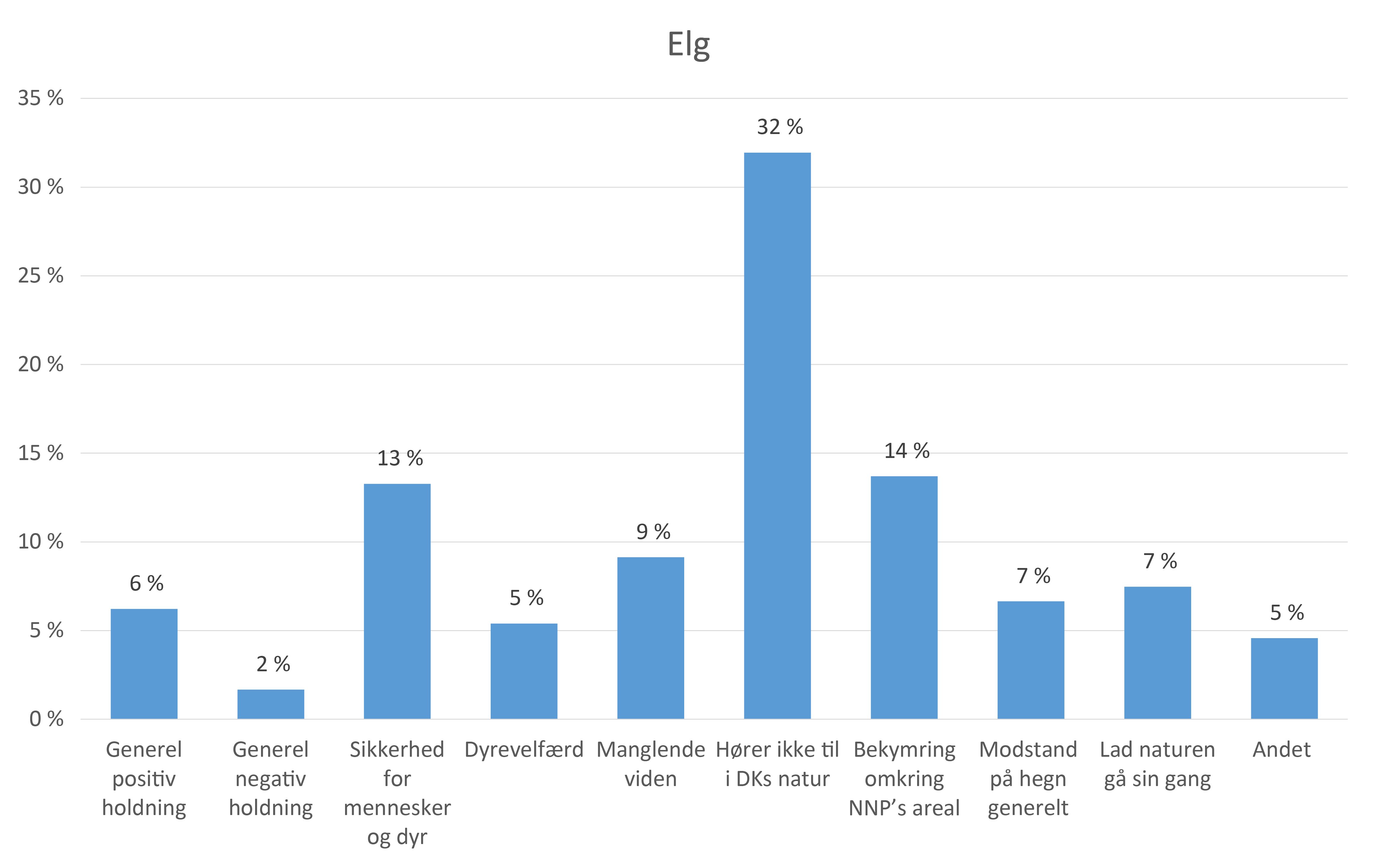 Fritekst-svarene vedrørende udsætning af denne gruppe af dyrearter viser, at mange ikke mener, at disse dyr hører til i Danmarks natur (32 % for elg og 22 % for bison). For elge gælder det, at en del mener, at naturnationalparkerne arealmæssigt ikke kan rumme disse dyr (14 %). For begge dyrearter er sikkerheden også et væsentligt opmærksomhedspunkt (13 % for elg og 15 % for bison). Derudover udtrykker svarpersonerne, at de mangler viden om dyrearterne generelt (9 % for elg og 13 % for bison).