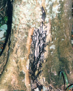 - Ud fra dens sorte strenge, som kaldes rhizomorfer, de består også af hvide hyfer (svampetråde) med en mørk ydre skal.
