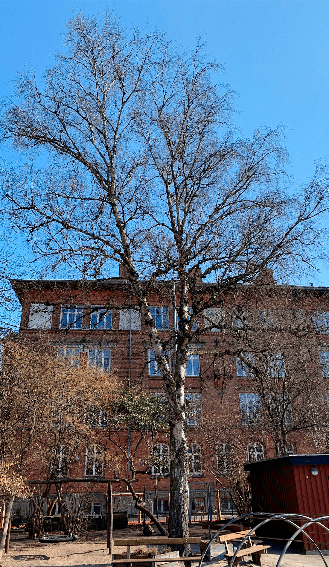 Denne birk står på en legeplads og har givet anledning til bekymring på grund af de mange knuder. Min første tanke var, at det var kræftknuder, men jeg har også tænkt på, om det kunne være birke-spejlporesvamp. Hvad mener I, og har knuderne betydning for træets stabilitet?